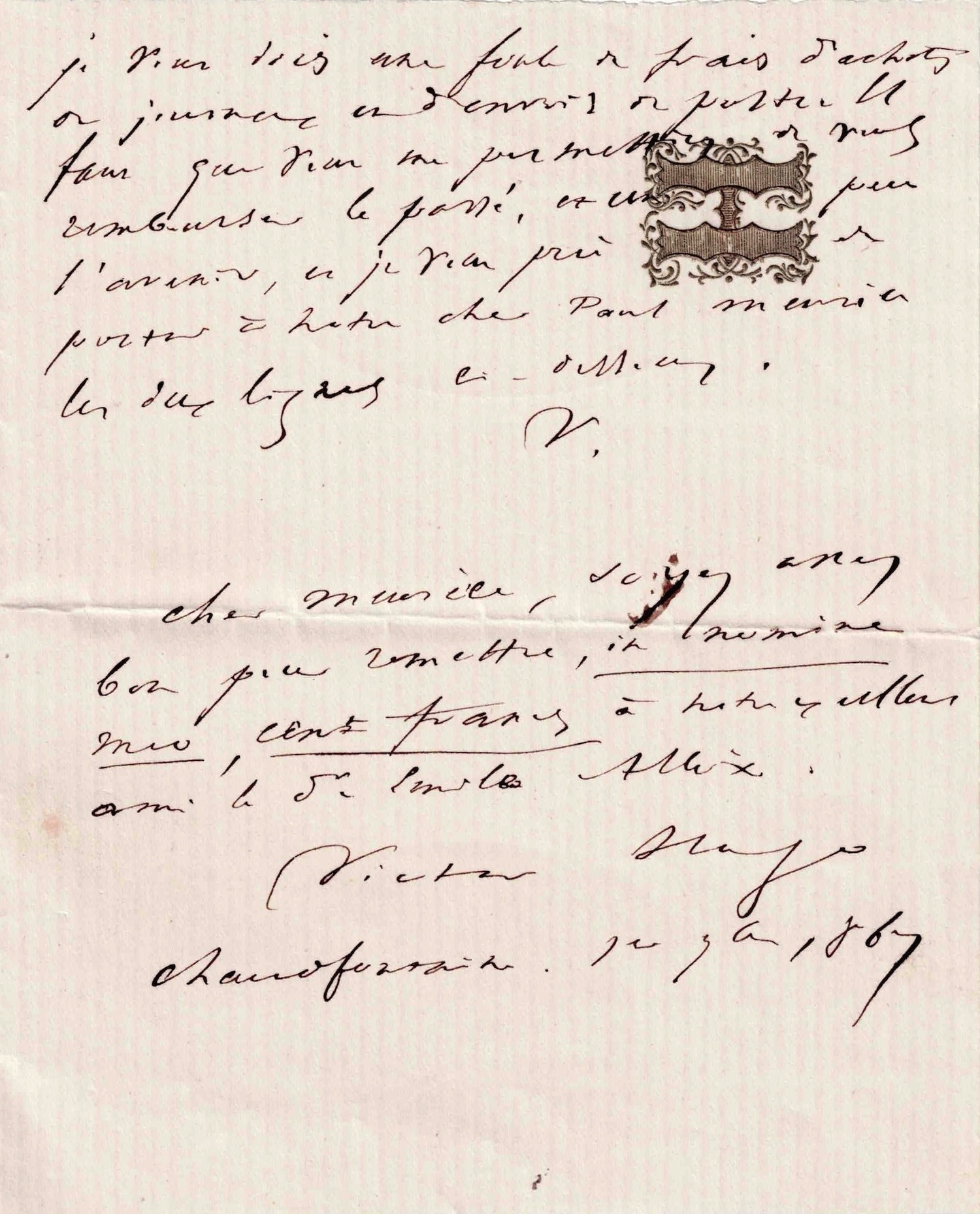 Dear Meurice, please be so kind as to give, in nomine mio, one hundred francs , to our excellent friend Dr. Emile Allix. Victor Hugo. Chaudfontaine. September 1 , 1867.