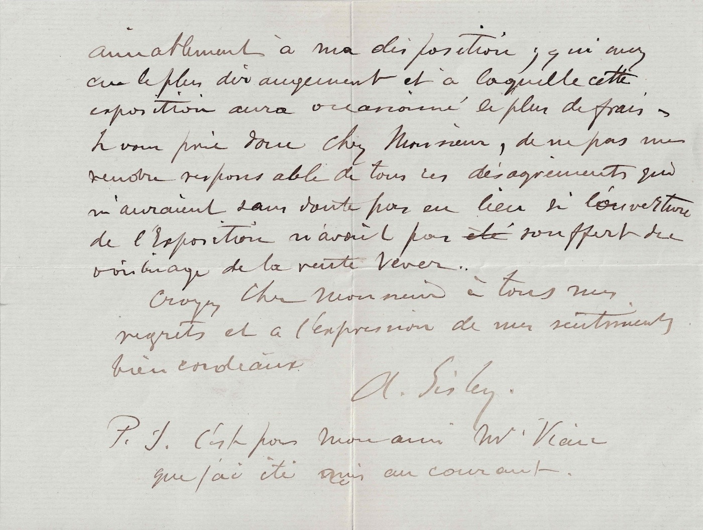 Sehr geehrter Herr, ich bitte Sie daher inständig, mir die entstandenen Unannehmlichkeiten nicht anzulasten . Sie wären zweifellos nicht eingetreten, wenn die Eröffnung der Ausstellung nicht durch die Nähe des Auktionshauses Vever beeinträchtigt worden wäre. Bitte nehmen Sie meine aufrichtige Entschuldigung und meine herzlichsten Grüße entgegen. A. Sisley. P.S.: [Georges] hat mich darüber informiert