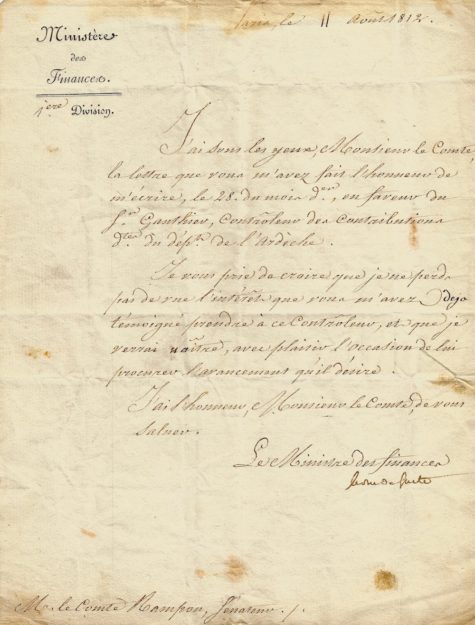 One page in-4° on ministry letterhead. Paris. August 11, 1812.