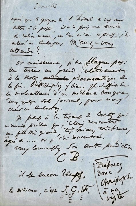 “Dopo che il cameriere dell'hotel [Hôtel de Dieppe] ha spedito la mia lettera, ho avuto voglia di leggerla di nuovo, e l'ho fatto; Ho eliminato un'interpretazione errata. Mi hai aspettato? Ora, non sto scherzando : sono terrorizzato dalla nota farmaceutica alla fine. Pensaci attentamente. Basta la malizia di un cattivo, su qualche giornale sporco, per crearci imbarazzo. Penso al lettore di carte che mi predisse che avrei incontrato una ragazza molto alta, molto magra, molto bruna, anziana... ma l'ho incontrata. Conosci l'altra sua previsione. CB. E' ancora tempo. La dedica è JGF Quindi prepara Christophe per la mia visita. »