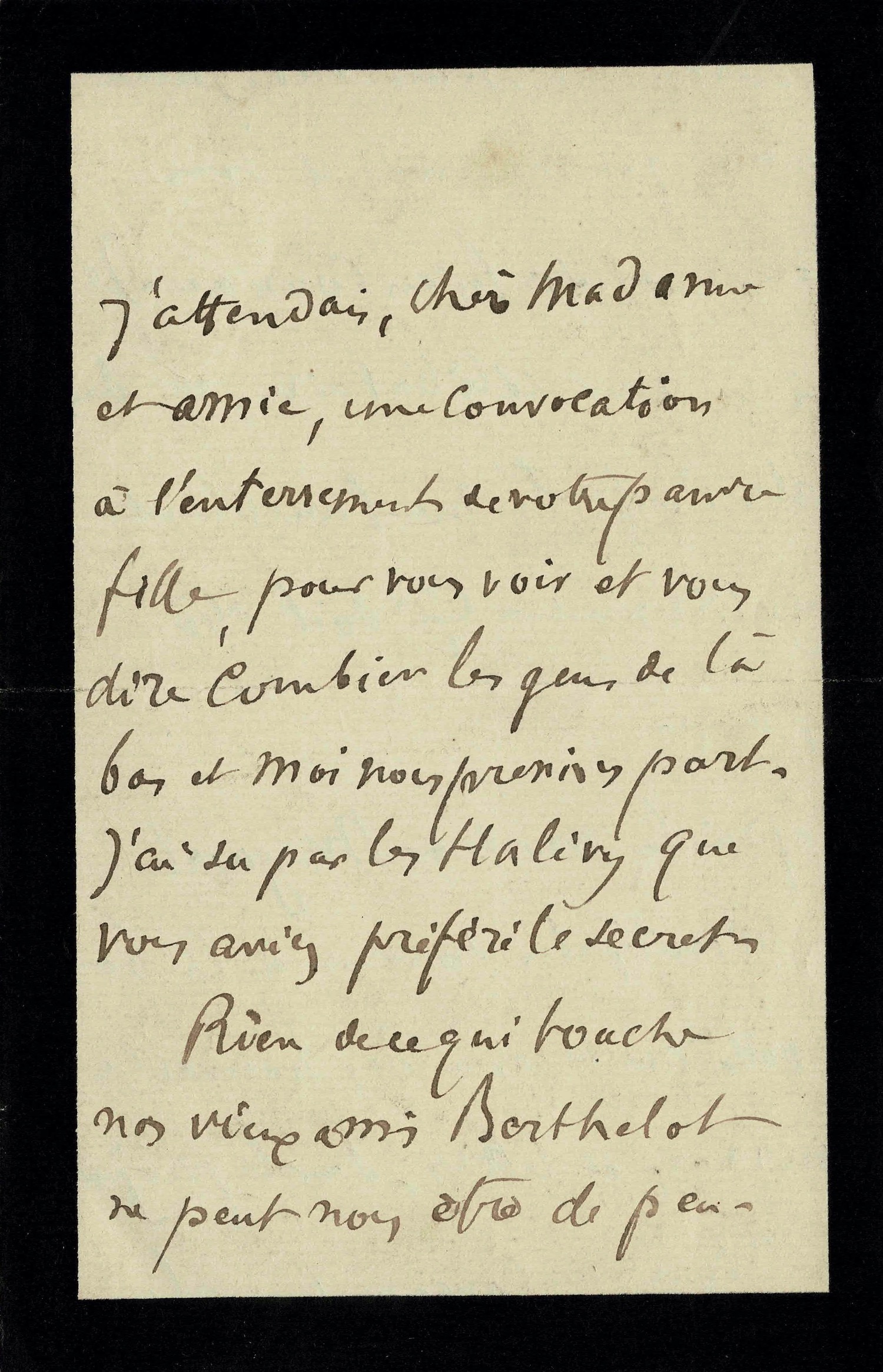 Commovente lettera di Degas in cui piange la morte di Hélène Berthelot – figlia di Sophie e Marcellin Berthelot – morta all'età di 32 anni. Il pittore è tanto più commosso in quanto ha appena perso la sorella Marguerite, morta a Buenos Aires poche settimane prima.