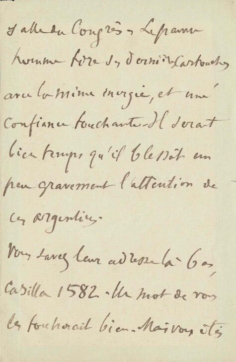 Conosci il loro indirizzo lì, Casilla 1582. Una tua parola li commuoverebbe davvero. Ma sei abbastanza bravo e fedele da averlo già fatto prima. Ti stringo la mano con molto affetto, così come quella del povero Berthelot. Amicizie. Degassare. »