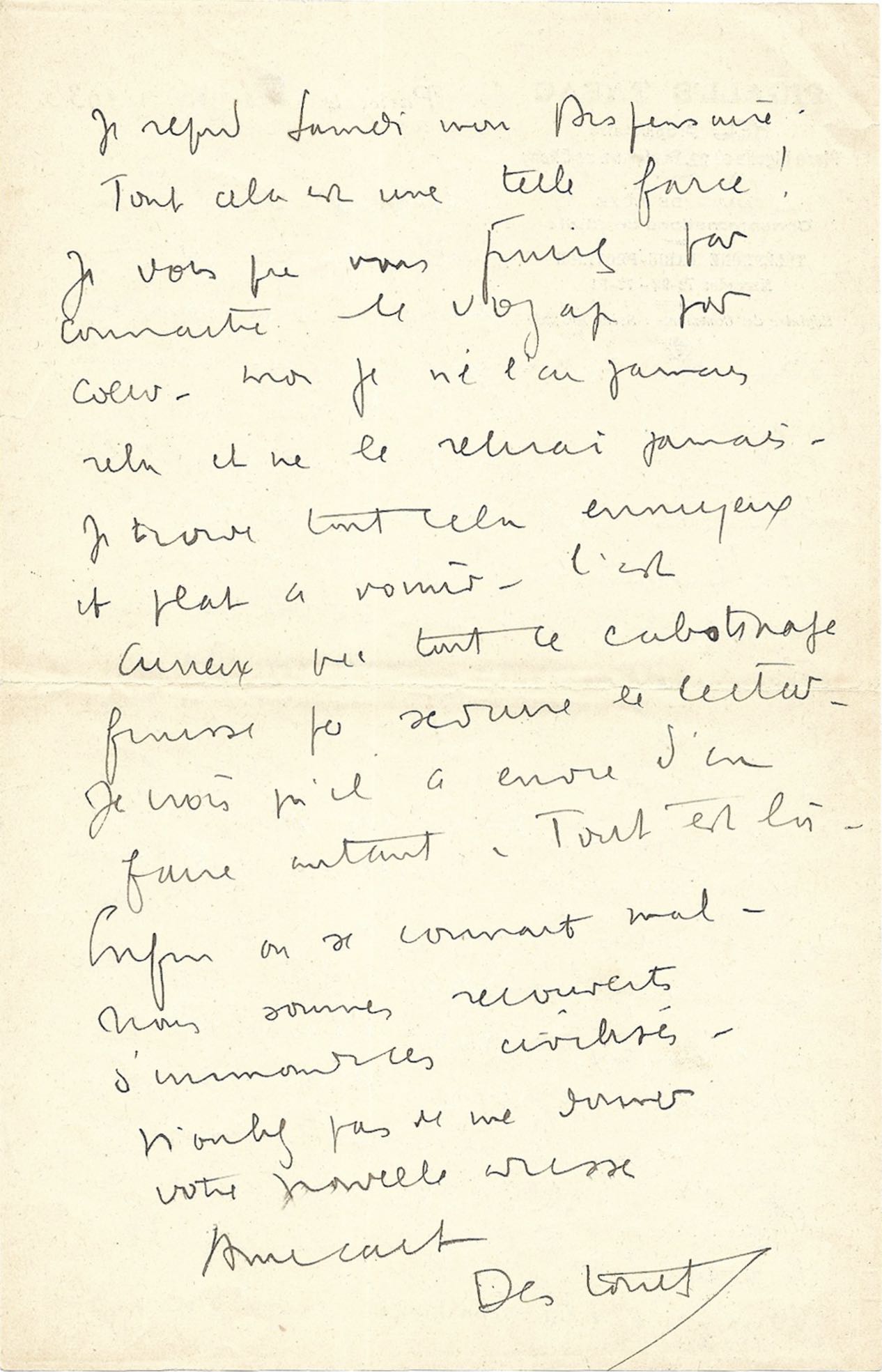 Lettre autographe signée à « Destouches » à Evelyne Pollet.