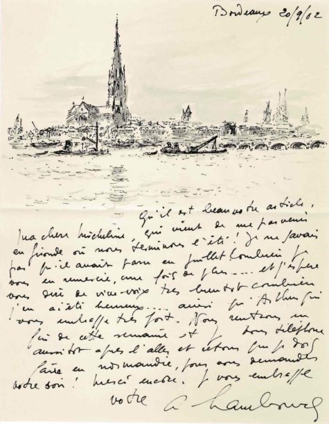 Belle lettre du peintre français enrichie d’un large dessin original – encre et gouache grise – figurant une vue de Bordeaux depuis les eaux de la Garonne.