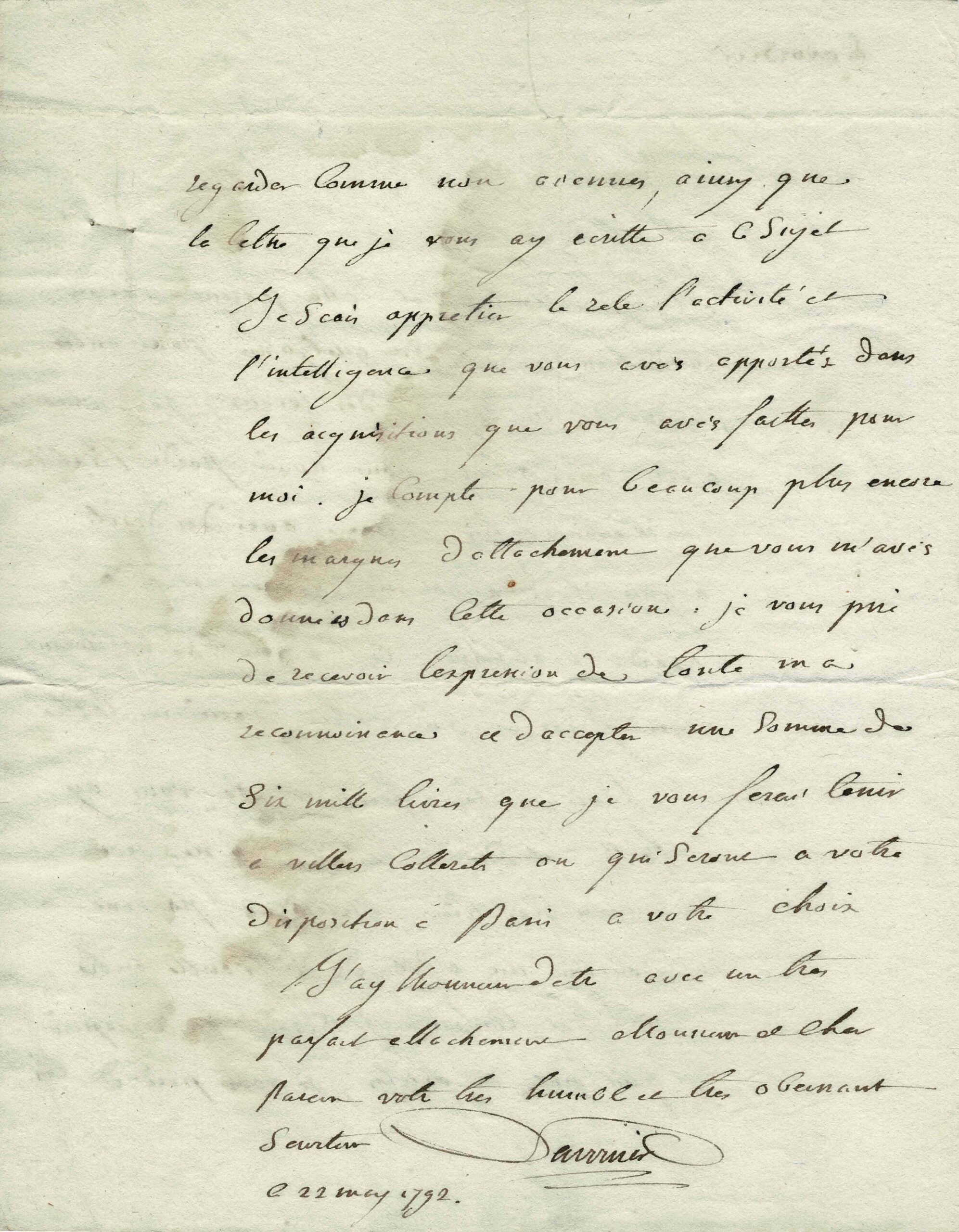 « Il faut Monsieur et cher parent avoir acquis bien des droits sur quelqu’un pour entreprendre de lui donner des leçons ; je commence à être assez vieux pour avoir perdu l’habitude d’en recevoir ; enfin même avec des droits acquis, il y a des ménagements et des égards à observer. C’est à quoi se borneront mes réflexions sur votre dernière lettre. Puisque les offres que je vous ai faites et sur lesquelles nous ne nous sommes pas bien entendus peuvent devenir un objet de difficulté entre nous et comme je serais au désespoir qu’il put en exister, je vous prie de les regarder comme non avenues, ainsi que la lettre que je vous ai écrite à ce sujet. Je sais apprécier le zèle, l’activité et l’intelligence que vous avez apportés dans les acquisitions que vous avez faites pour moi. Je compte pour beaucoup plus encore les marques d’attachement que vous m’avez données dans cette occasion. Je vous prie de recevoir l’expression de toute ma reconnaissance et d’accepter une somme de six mille livres que je vous ferai tenir à Villers-Cotterêts ou qui seront à votre disposition à Paris à votre choix. J’ai l’honneur d’être, avec un très parfait attachement, Monsieur et cher parent, votre très humble et très obéissant serviteur. Lavoisier. »