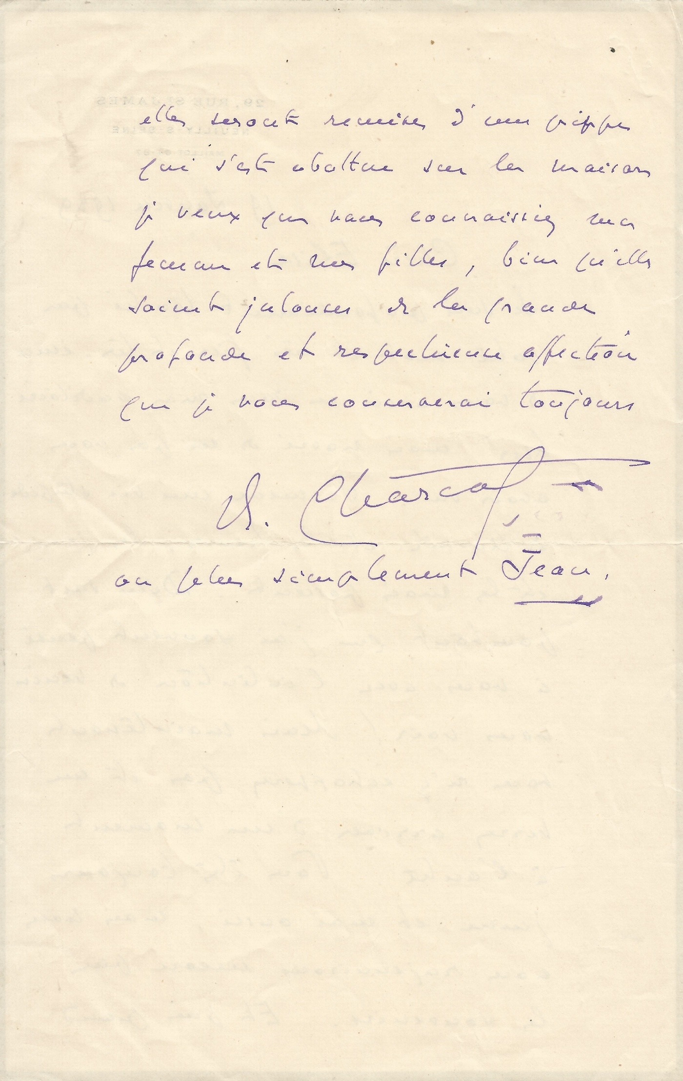 « Chère Élise, Je suis profondément touché par votre mot et très fier et très ému de vous avoir eu[e] mon auditoire hier, mais navré de ne pas vous avoir vu[e]. Je mène une vie stupide de travail et les heures, les jours et les mois passent. Dieu sait pourtant que j’ai souvent pensé à vous avec l’intention de venir vous voir ! Mais maintenant vous n’y échapperez pas et me verrez arriver d’un moment à l’autre. Vous êtes toujours jeune et moi aussi, mais nous nous rajeunirons encore par les souvenirs. Et puis quand elles seront remises d’une grippe qui s’est abattue sur la maison je veux que vous connaissiez ma femme et mes filles, bien qu’elles soient jalouses de la grande, profonde et respectueuse affection que je vous consacrerai toujours. JB. Charcot, ou plus simplement Jean. »