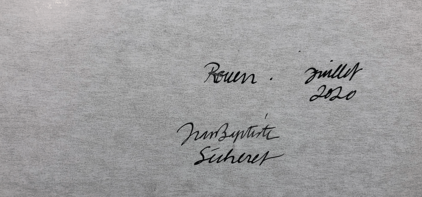 Jean-Baptiste SÉCHERET (1957-) Œuvre originale signée. Rouen Pastel sur papier fort. Signé et daté au pastel blanc en bas à droite Sécheret. 20 Signé, daté et titré à l’encre au dos : Rouen, juillet 2020, Jean-Baptiste Sécheret. Extraordinaire et délicate vue des toits, clochers, et du ciel de Rouen aux couleurs anthracites. Format : 105 × 240 mm Formulaire de contact Prénom Nom Téléphone Email Message Envoyer
