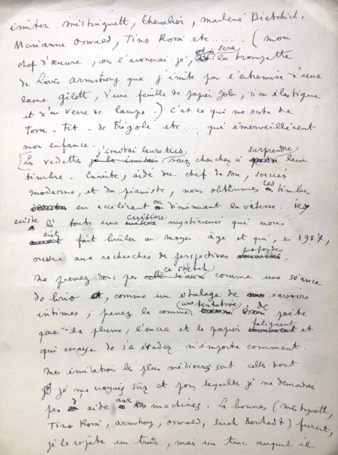 Donc vous m’entendrez au poste Radio Luxembourg imiter Mistinguett, Chevalier, Marlène Dietrich, Marianne Oswald, Tino Rossi, etc…… (Mon chef-d’œuvre, vous l’avouerai-je, sera la trompette de Louis Armstrong que j’imite par l’entremise d’une lame Gilett, d’une feuille de papier Job, d’un élastique et d’un verre de lampe.) C’est ce qui me reste de Tom-Tit, de Fregoli etc… qui émerveillèrent mon enfance.