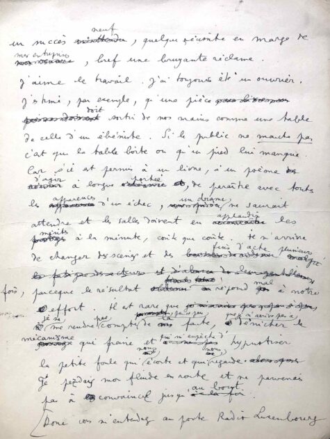 J’aime le travail. J’ai toujours été un ouvrier. J’estime, par exemple, qu’une pièce doit sortir de nos mains comme une table de celle [sic] d’un ébéniste. Si le public ne marche pas c’est que la table boite ou qu’un pied lui manque. Car s’il est permis à un livre, à un poème d’agir à longue portée, de paraître avec toutes les apparences d’un échec, un drame ne saurait attendre et les salles doivent en applaudir les mérites à la minute, coûte que coûte. Il m’arrive de changer des scènes et des fins d’acte plusieurs fois, parce que le résultat répond mal à notre effort. Il est rare que je ne me rende pas compte, peu à peu, de la faute, que je n’arrive pas à dénicher le mécanisme qui freine et qui m’empêche d’hypnotiser la petite foule qui nous écoute et qui nous regarde. Je perdais mon fluide en route et ne parvenais pas à convaincre jusqu’au bout.