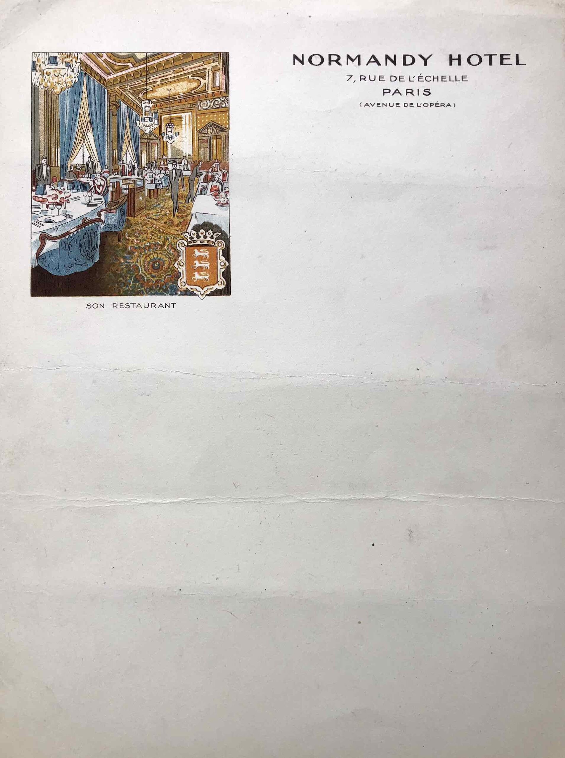 Trois pages ½ in-folio au verso de papiers à en-tête du Normandy Hotel, Paris.