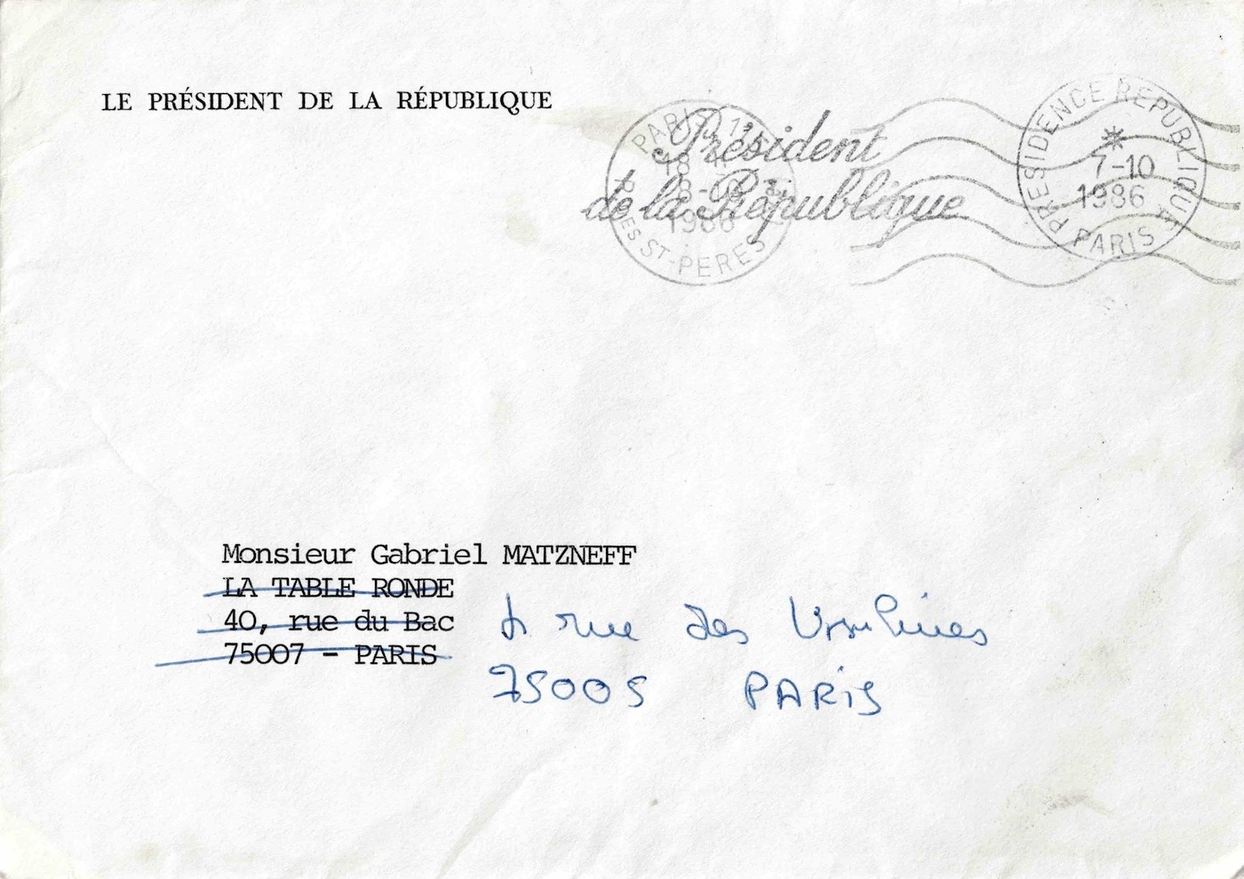François MITTERRAND Lettre autographe signée à Gabriel Matzneff. Une page in-8° sur papier à l’en-tête du président de la République. Enveloppe conservée. Paris. 6 octobre 1986. _________________________________________________ « Je vous remercie, cher ami, de l’envoi de votre livre. Il sera lu, croyez-le. Je vous ferai signe (mon secrétariat est prévenu) car j’aimerais vous voir. A vous. François Mitterrand. » _________________________________________________ Formulaire de contact Prénom Nom Téléphone Email Message Envoyer
