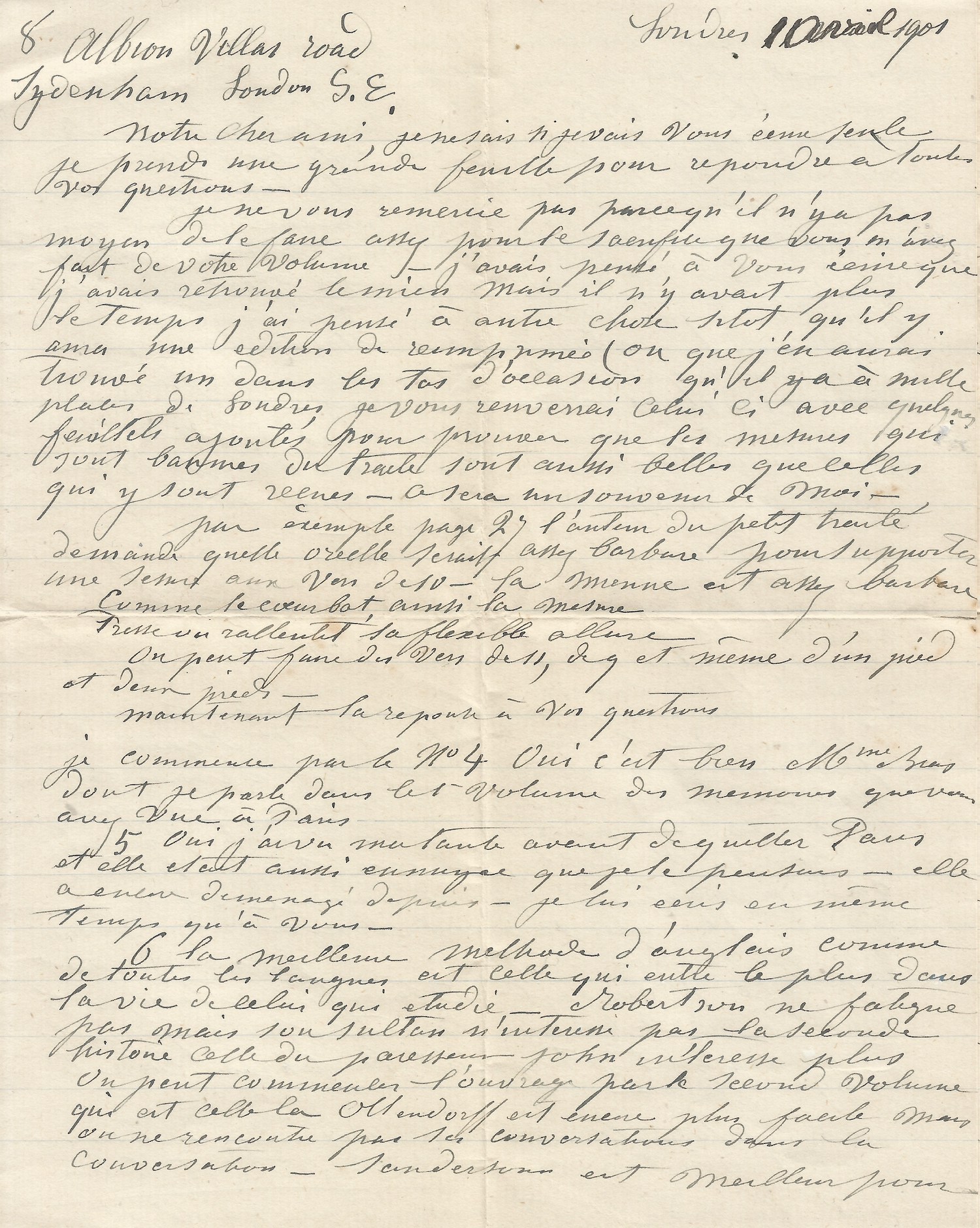 Louise Michel promet de renvoyer à Roy son exemplaire d’un traité de poésie, avec quelques feuillets ajoutés “pour prouver que les mesures bannies du traité sont aussi belles que celles qui y sont reçues” et donne quelques exemples de ce qui peut se supporter dans le nombre de pieds versifiés.