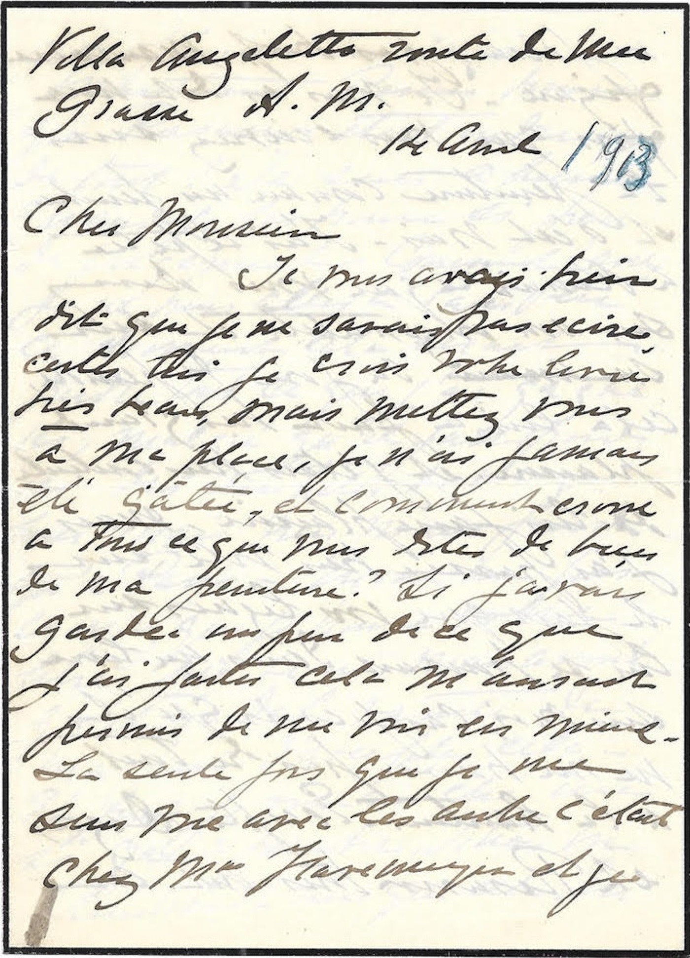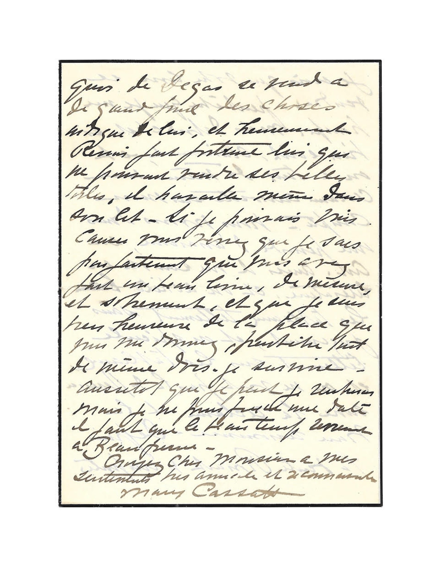 « Cher Monsieur, Je vous avais bien dit que je ne savais pas écrire. Certes oui je crois votre livre* très beau mais mettez-vous à ma place, je n’ai jamais été gâtée, et comment croire à tout ce que vous dites de bien de ma peinture ? Si j’avais gardé un peu de ce que j’ai fait, cela m’aurait permis de me voir en mieux. La seule fois que je me suis vue avec les autres, c’était chez Mme Havemeyer** et je ne faisais pas trop mauvaise figure. Je vous ai dit une fois que vous écriviez sur la peinture comme un peintre et c’est vrai. J’ai répété à Renoir ce que vous disiez sur son originalité et sur sa joie de peindre, cela lui a fait très grand plaisir, et j’étais bien contente de lui faire plaisire [sic], mais j’ai passée [sic] bien vite sur le fait que vos lignes sur lui se trouvai[en]t dans un livre sur moi, car je crois qu’il ne me trouve pas du tout à la hauteur.