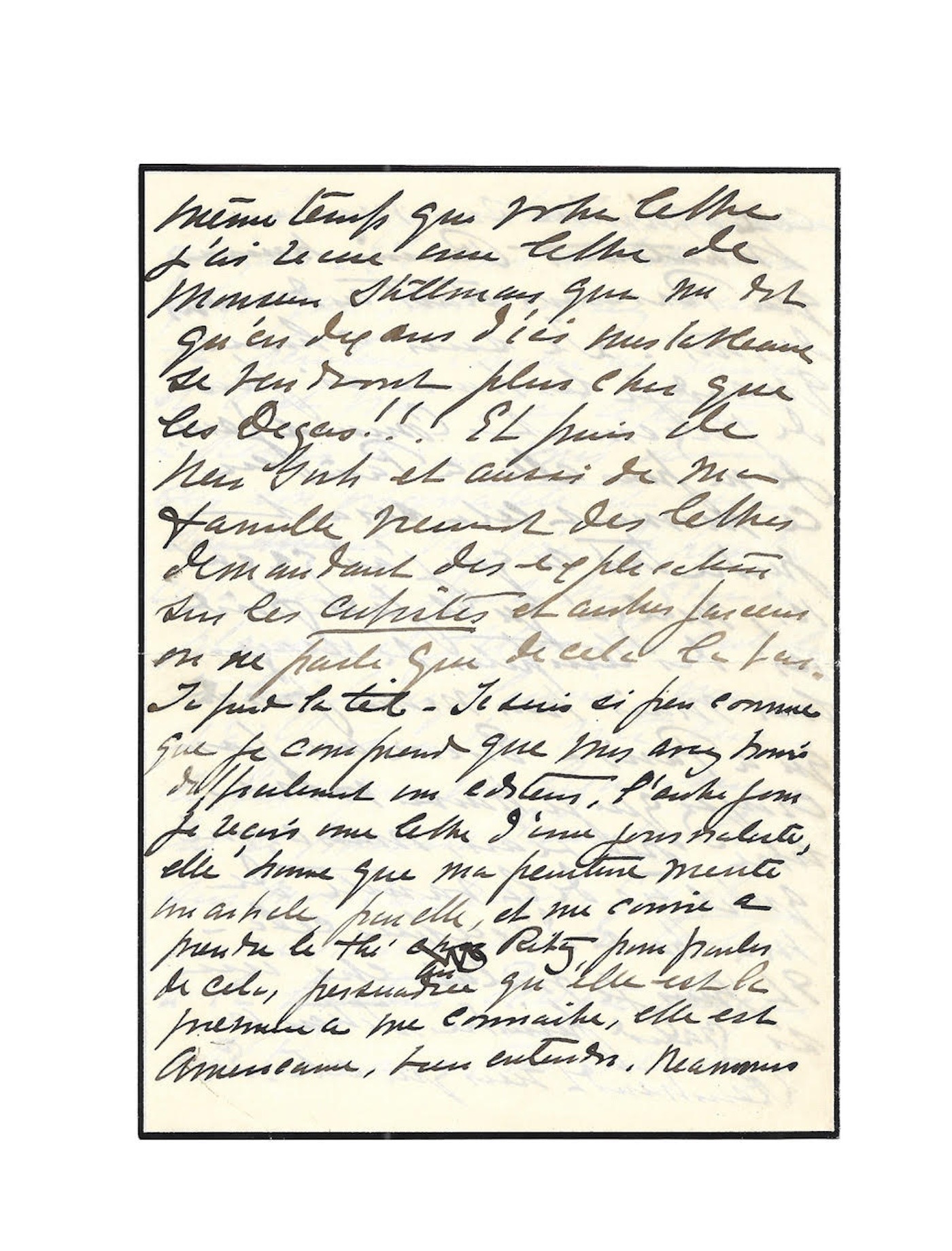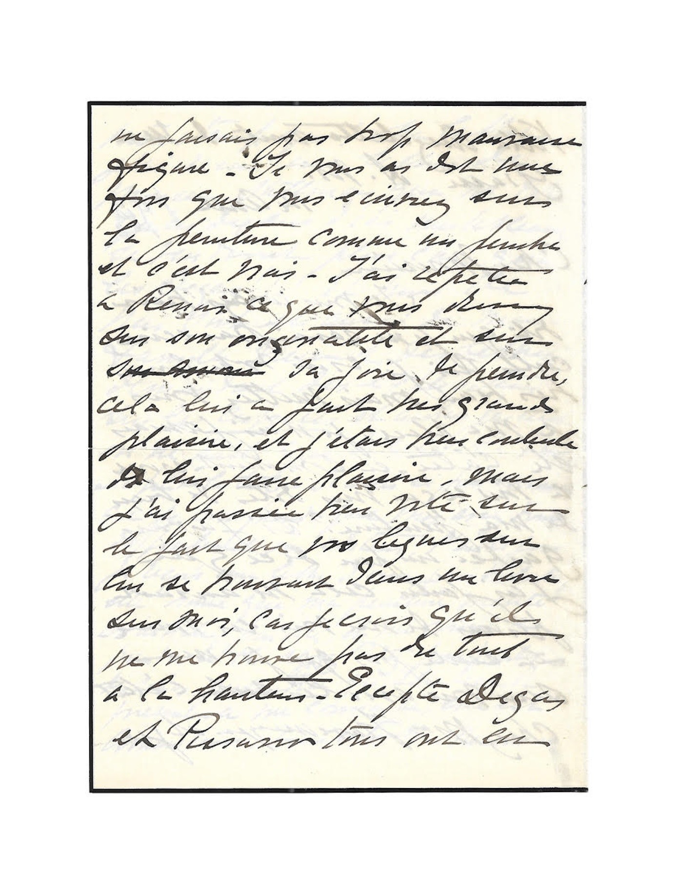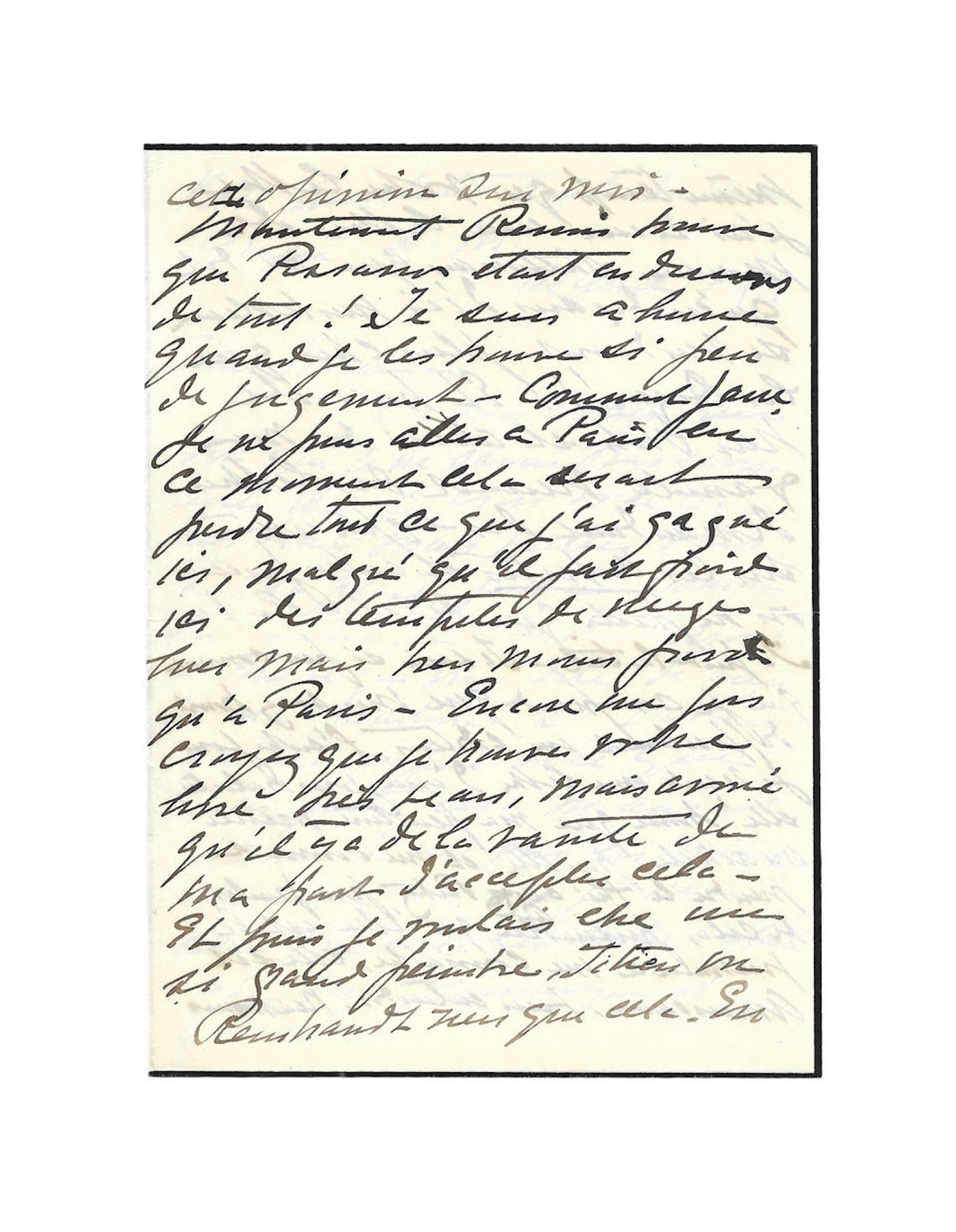 Excepté Degas et Pissarro, tous ont eu cette opinion sur moi. Maintenant, Renoir trouve que Pissarro était en-dessous de tout ! Je suis ahurie quand je les trouve [sic] si peu de jugement – Comment faire. Je ne puis plus aller à Paris en ce moment cela serait perdre tout ce que j’ai gagné ici, malgré qu’il fait froid ici des tempêtes de neiges hier, mais bien moins froid qu’à Paris – Encore une fois, croyez que je trouve votre livre très beau, mais avoué [sic] qu’il y a de la vanité de ma part d’accepter cela. Et puis je voulais être un si grand peintre, Titien ou Rembrandt, rien que cela.