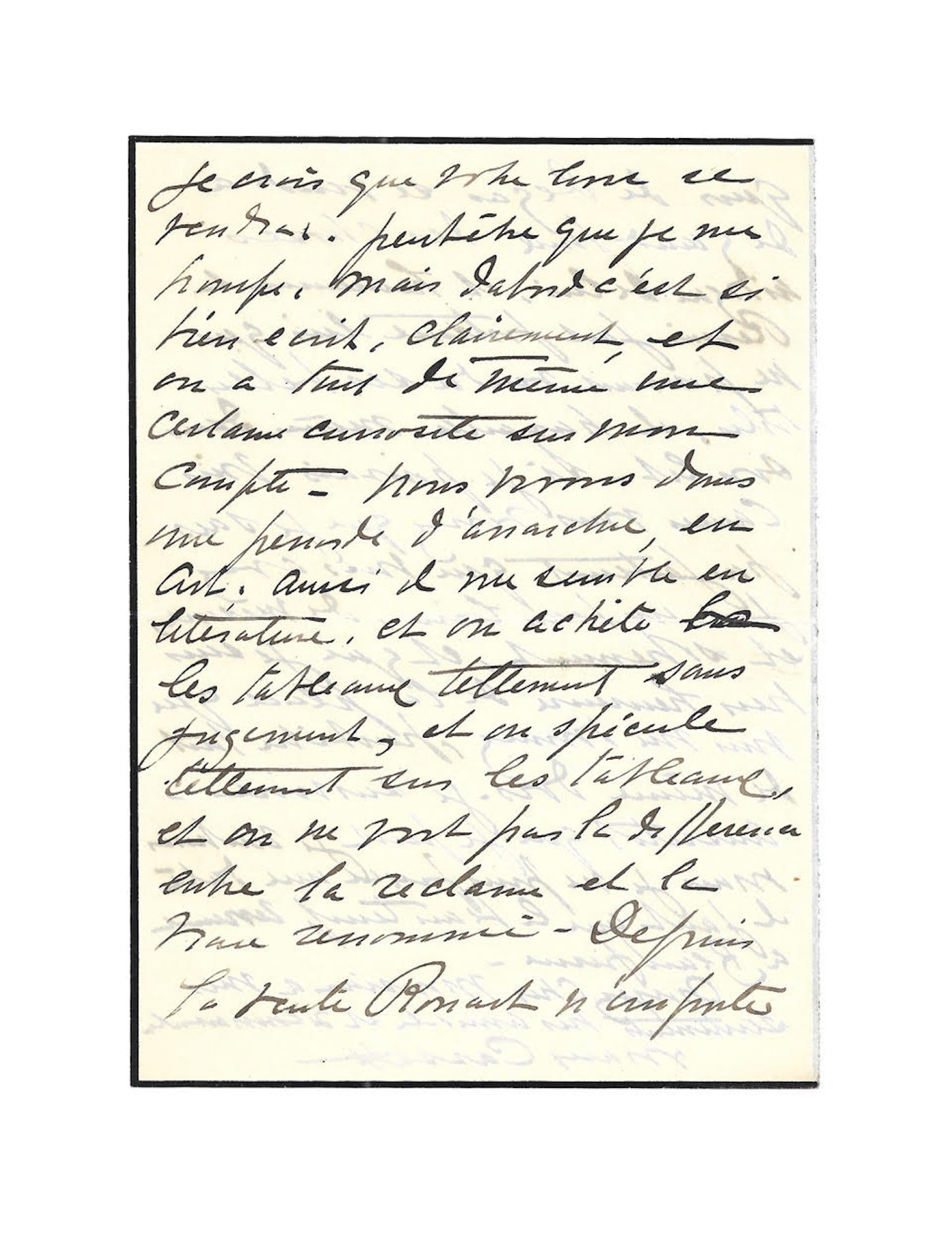 Néanmoins, je crois que votre livre se vendra. Peut-être que je me trompe, mais d’abord c’est si bien écrit, clairement, et on a tout de même une certaine curiosité sur mon compte. Nous vivons dans une période d’anarchie, en art ; aussi, il me semble en littérature, et on achète les tableaux tellement sans jugement, et on spécule tellement sur les tableaux, et on ne voit pas la différence entre la réclame et la vraie renommée – Depuis la vente Rouart**** n’importe quoi de Degas se vend à de grands prix, des choses indignes de lui, et heureusement Renoir fait fortune, lui qui ne pouvait vendre ses belles toiles, il travaille même dans son lit.