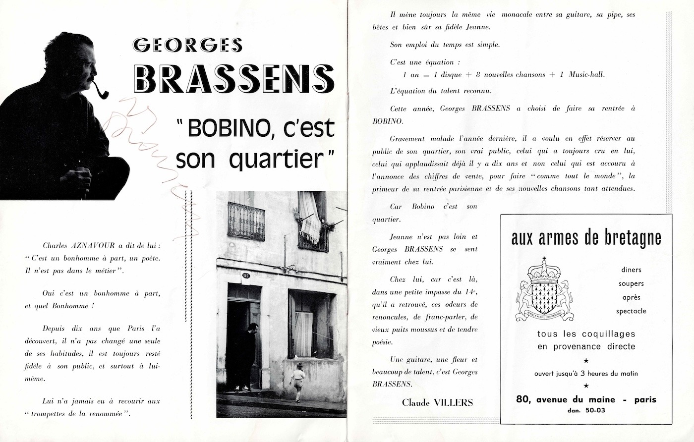 Rare dépliant promotionnel – exemplaire n°1 – de la salle de music-hall parisienne, pour la rentrée 1963, figurant Georges Brassens en couverture, en pleine page.