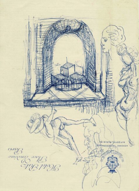 Salvador DALÍ (1904.1989) Dessins originaux. Une page in-8° sur papier à en-tête de l’Hôtel Ritz. Cachet de la collection Peter Moore au verso. Sans date. Superbe feuille d’études du maître catalan : au stylo bleu, Dalí esquisse plusieurs études hétéroclites. Une vision architecturale, qui semble être incluse au sein d’une agora théâtrale, domine, en son centre, la composition. En marges, apparaissent un profil de femme, un corps féminin dénudé, un couple enlacé en plein coït et le portrait de Dante Alighieri de profil. Formulaire de contact Prénom Nom Téléphone Email Message Envoyer